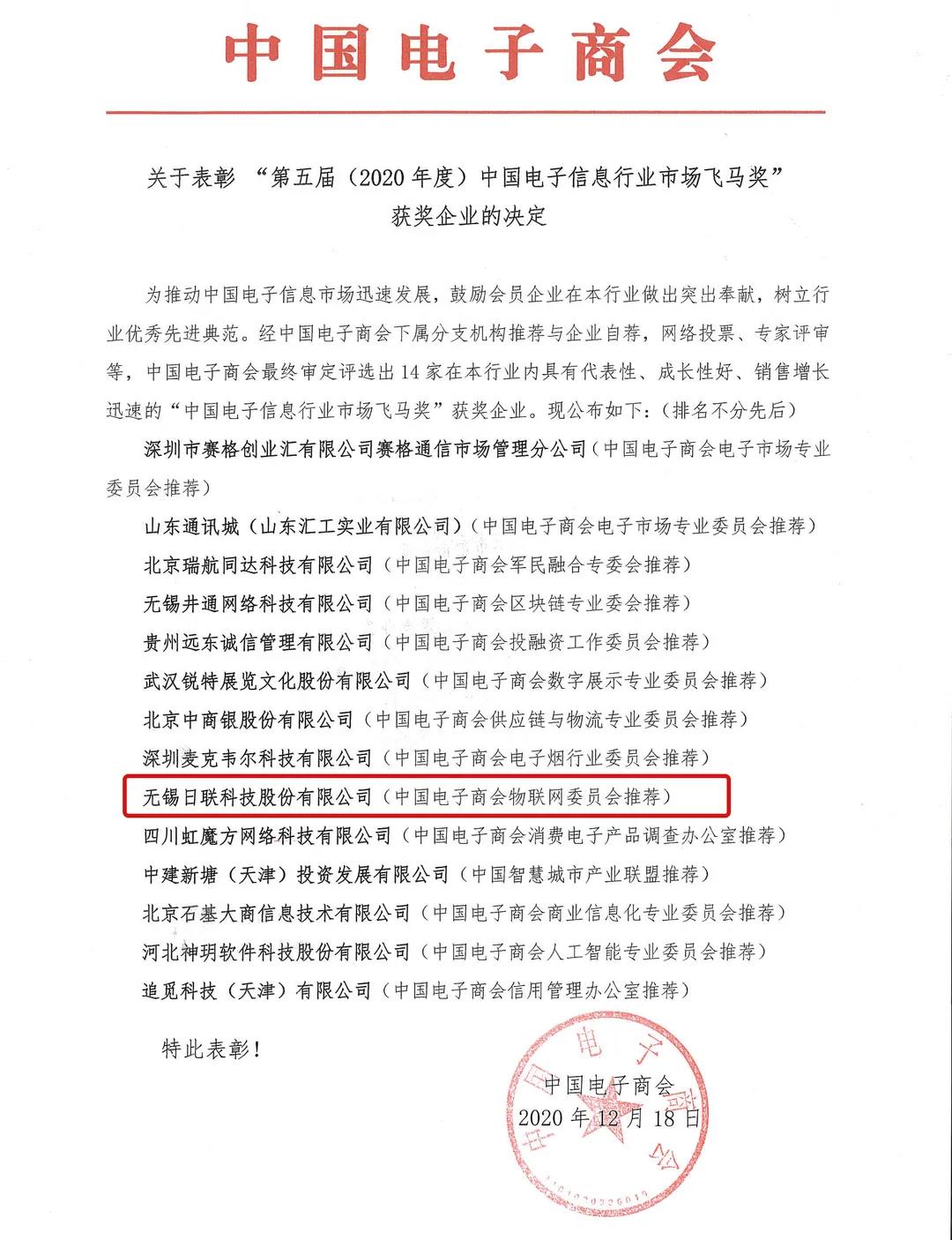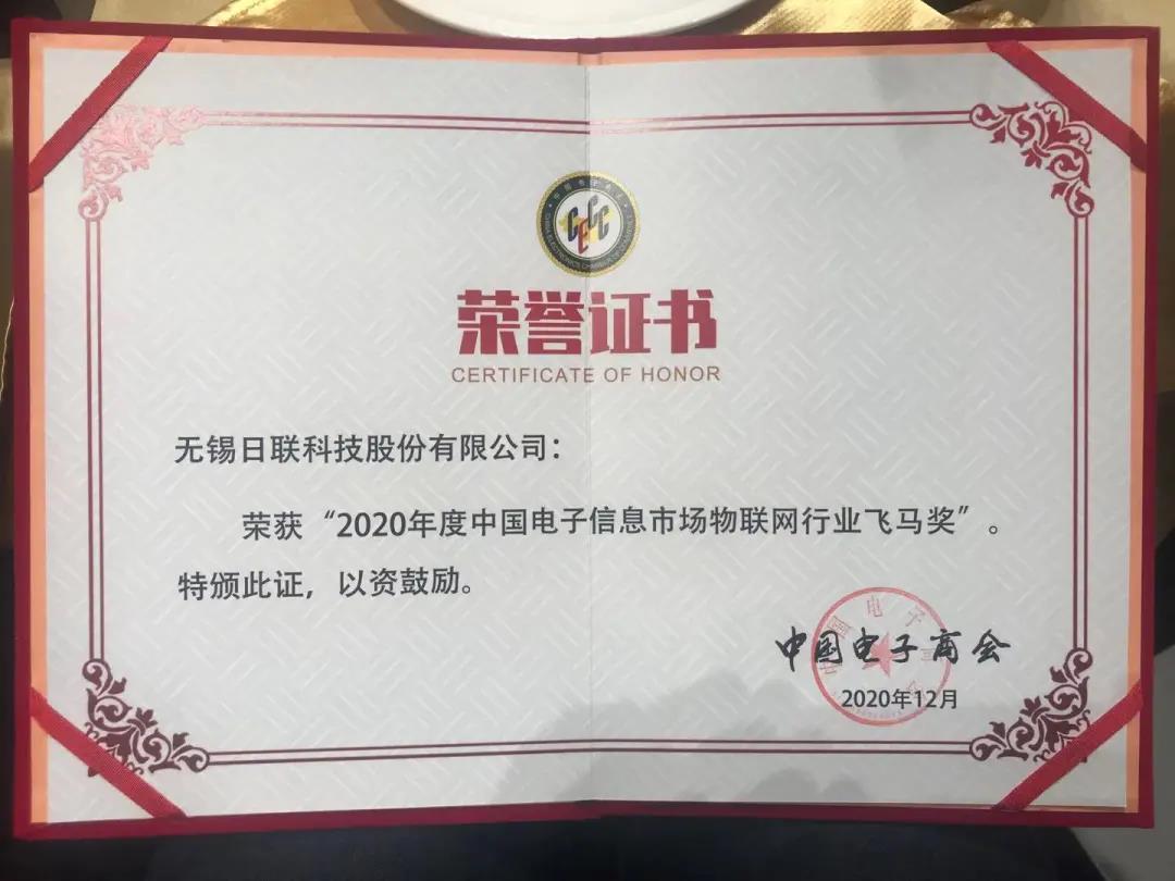 2020年12月18日,第五屆(2020年度)中國電子信息行業(yè)市場飛馬獎(jiǎng)評選隆重揭曉,這是中國電子商會年度評選的**獎(jiǎng)項(xiàng),日聯(lián)科技榮譽(yù)在列。