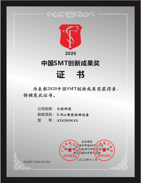 第十六屆中國華南SMT學術與應用技術年會于2020年12月18日在深圳成功舉辦,同期舉行的“2020中國SMT創(chuàng)新成果獎”頒獎典禮上,日聯(lián)科技代表榮耀登臺受獎,該獎項旨在表彰企業(yè)在SMT設備及物料的技術提升、科技創(chuàng)新、產品研發(fā)等方面做出的杰出貢獻。