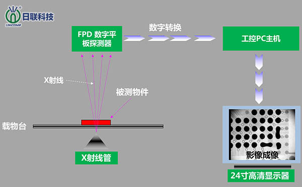 當(dāng)板子沿著導(dǎo)軌進(jìn)入機(jī)器內(nèi)部后,位于板子上方有一X-ray發(fā)射管,其發(fā)射的X射線穿過板子被置于下方的探測器(一般為攝像機(jī))所接受,由于焊點(diǎn)中含有可以大量吸收X射線的鉛,因此與穿過玻璃纖維銅、硅等其他材料的X射線相比,照射在焊點(diǎn)上的X射線被大量吸收,而呈現(xiàn)黑點(diǎn)產(chǎn)生良好的圖像,使得對焊點(diǎn)的分析變得相當(dāng)簡單直觀,故簡單的圖像分析算法便可自動(dòng)且可靠地檢驗(yàn)焊點(diǎn)的缺陷。