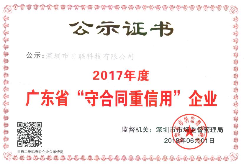 近日,廣東省工商行政管理局發(fā)布關(guān)于2017年度 “廣東省守合同重信用企業(yè)”的公告,日聯(lián)科技憑借十多年來的積累與信譽(yù),再度榮獲“守合同重信用企業(yè)”這一榮譽(yù)稱號(hào)。