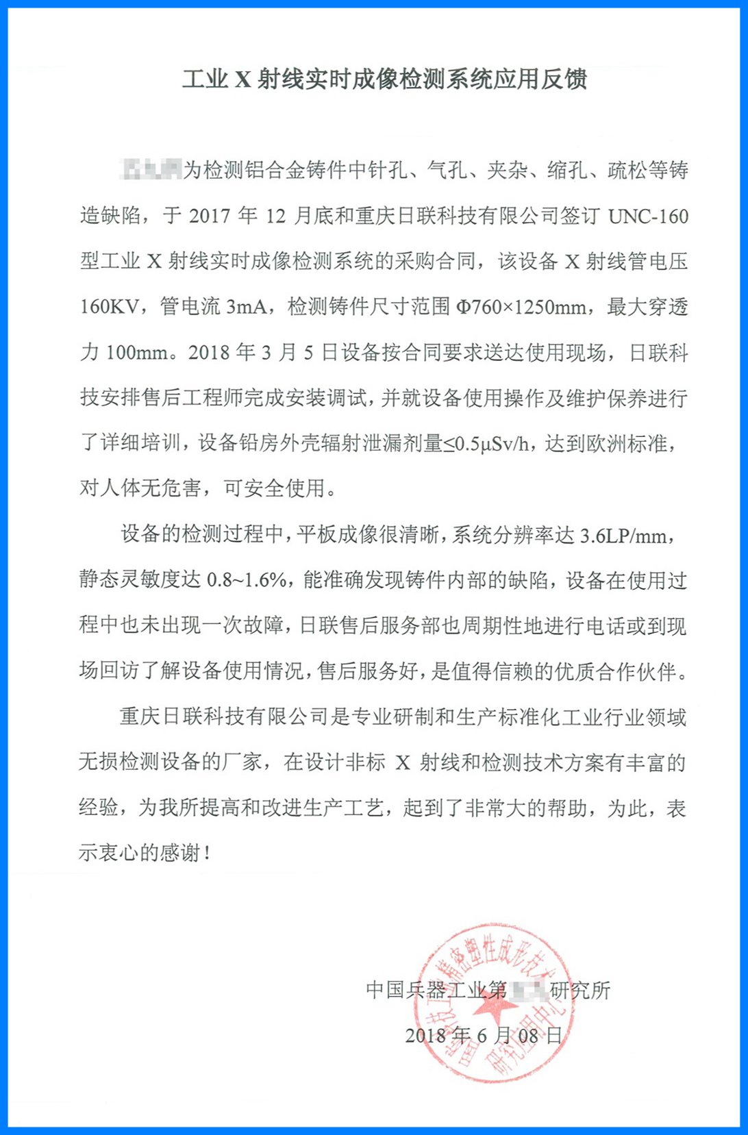 近日,日聯(lián)科技收到了中國兵器工業(yè)集團反饋的用戶使用報告。在該報告中,中國兵器工業(yè)集團對我司設(shè)備穩(wěn)定可靠的工作性能、專業(yè)細致的售后服務(wù)、完善詳盡的操作培訓(xùn)給予了高度的認可和評價,并重點指出我們的UNC160工業(yè)X射線實時成像檢測設(shè)備能準確發(fā)現(xiàn)鑄件的內(nèi)部缺陷,為他們產(chǎn)品質(zhì)量的提高和生產(chǎn)工業(yè)的改進提供了可靠保障,稱贊我們?nèi)章?lián)科技為值得信賴的企業(yè)合作伙伴。